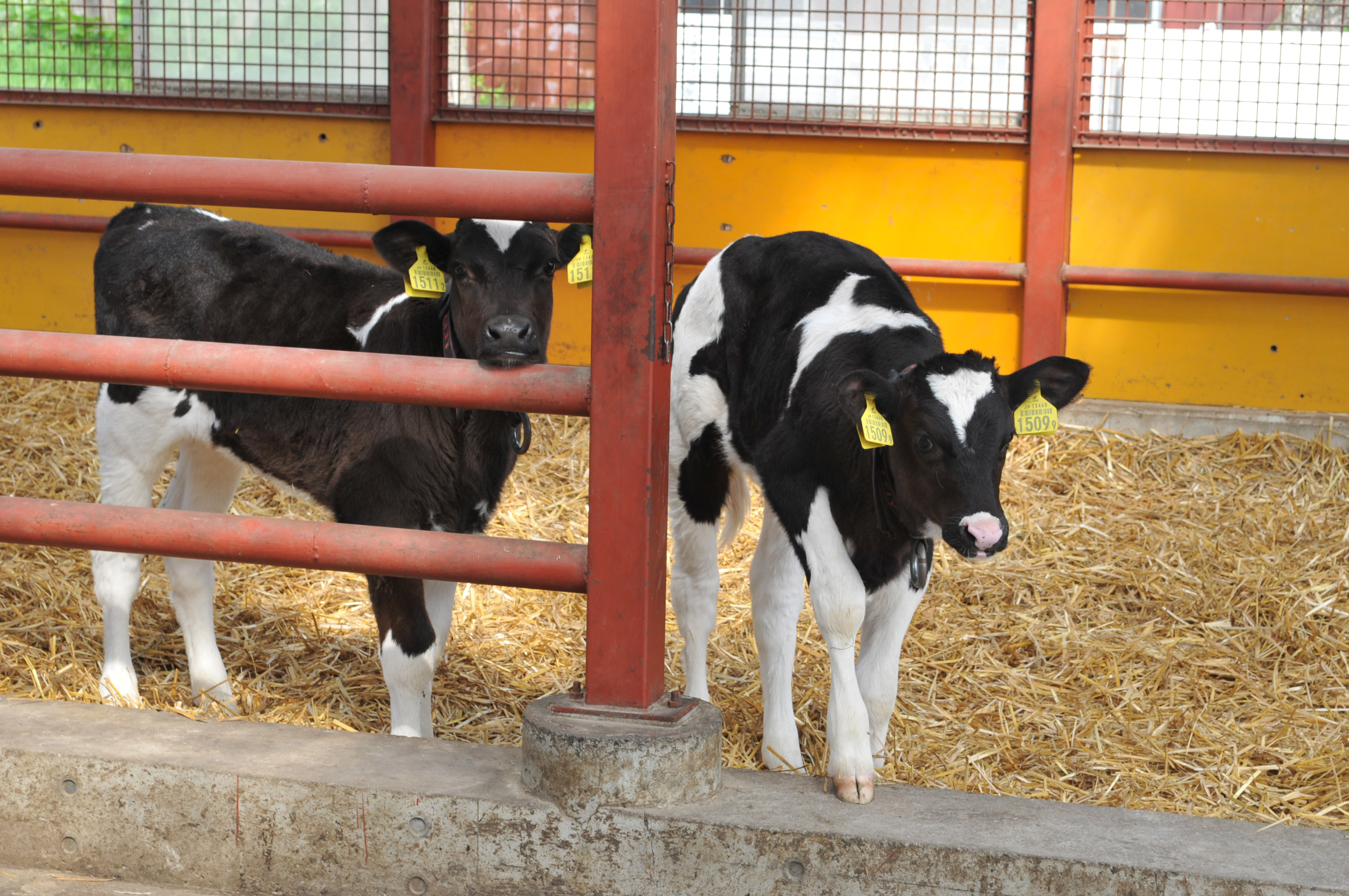 育成舎と育成牛たちです。ここでは生後3ヶ月齢から初産分娩までの約250頭を飼育しています。月齢にあわせた給餌を行い、毎日清掃を行って清潔な環境を整え、健康な成牛へと育てます。